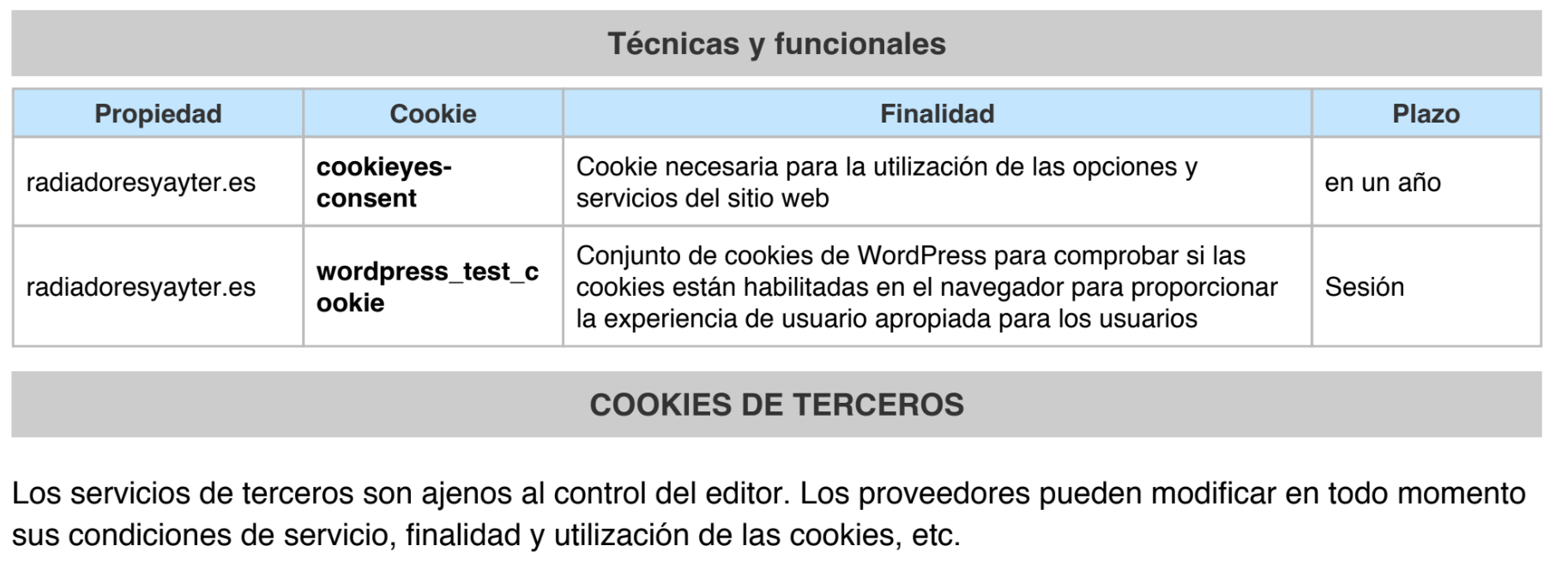 COOKIES UTILIZADAS EN ESTE SITIO WEB